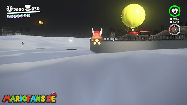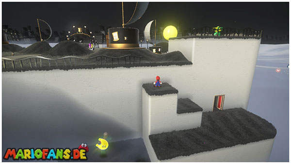 Nördlich von der kleinen Insel, auf der du den Mondwürfel zerstört hast, ist im Nebel ein kleines Zylinder-Häuschen, dessen Antenne glitzert. Wirf Cappy darauf und lass ihn ein paar Runden drehen bis der Mond erscheint.