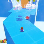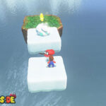 Reise zum Schnellreise-Punkt „Über den Fossilfällen„. Dreh dich um und spring eine Plattform nach unten. Du siehst weiße Hüte, welche sich in Wolken verwandeln, sobald du sie mit Cappy berührst. Bau dir so einen Weg zum Power-Mond.