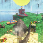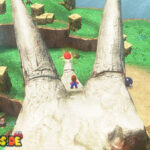 Reise zum Schnellreise-Punkt „Über den Fossilfällen„. Kletter auf den Schädel von dem Knochen-Dino. Auf dem Horn musst du Cappy etliche Runden drehen lassen, damit ein Power-Mond erscheint.