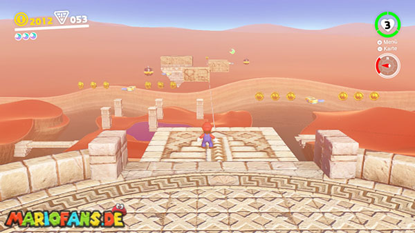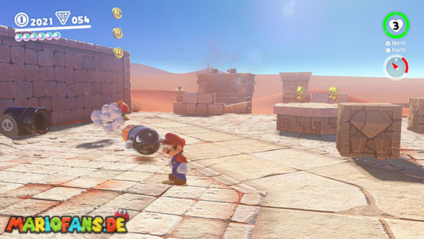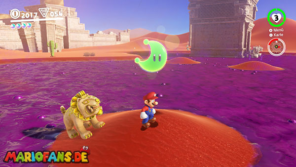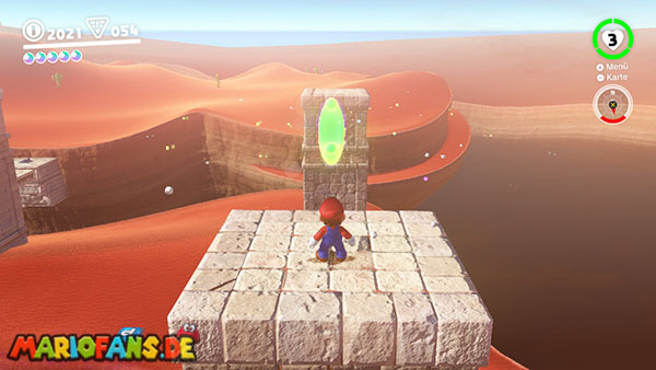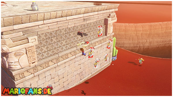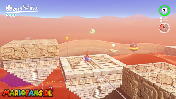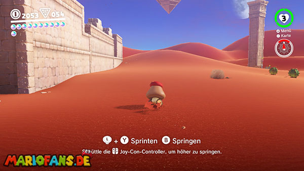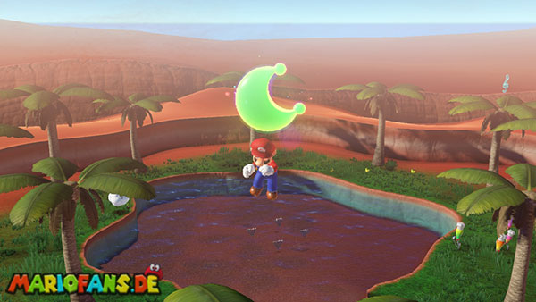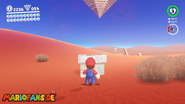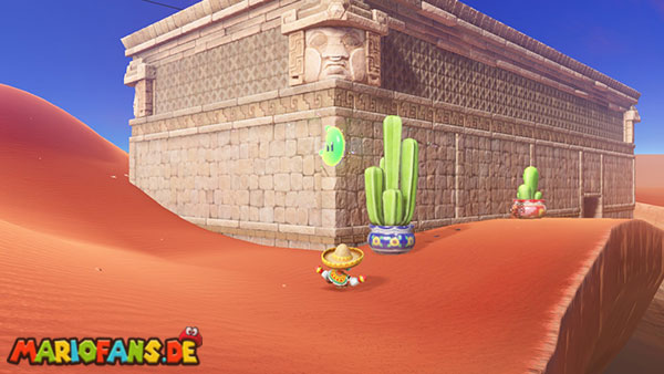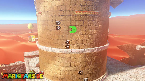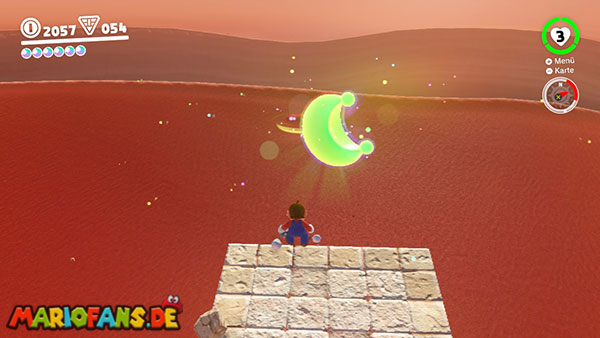 Reise zum Schnellreise-Punkt „Brutzelebene: Ruinen – Sandsäulen„. Spring nach unten und capere einen Kugelwilli. Flieg zum Power-Mond auf der Steinsäule. Verlass den Kugelwilli und warte bis ein neuer heran fliegt. Spring dann auf die zweite Steinsäule und capere auch diesen Kugelwilli und flieg Richtung Spielgrenze von der Wüste und schüttel dabei die Controller um schneller zu fliegen. Auf einer Säule siehst du einen leuchtenden Steinblock. In diesem ist der Power-Mond.