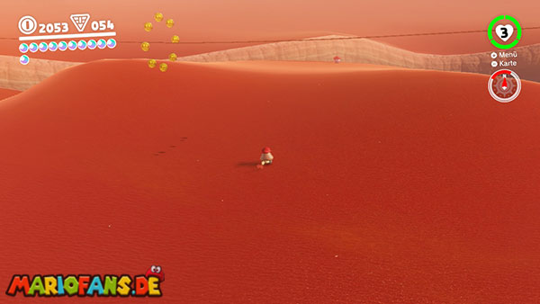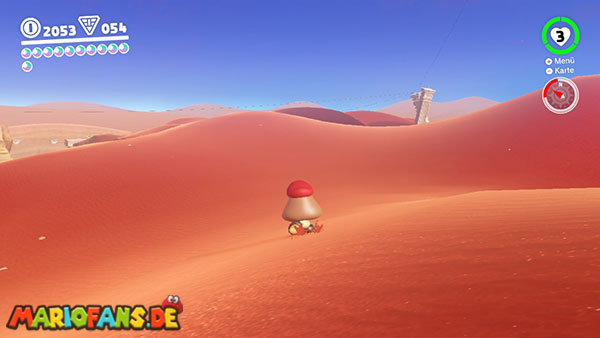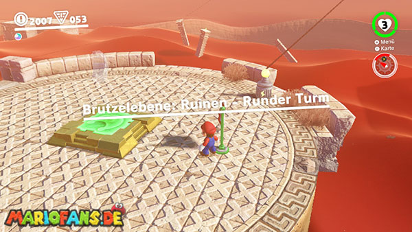 Reise zum Schnellreise-Punkt „Brutzelebene: Ruinen – Runder Turm„. Spring vom Turm aus nach hinten links. Im Treibsand siehst du einen Power-Mond.