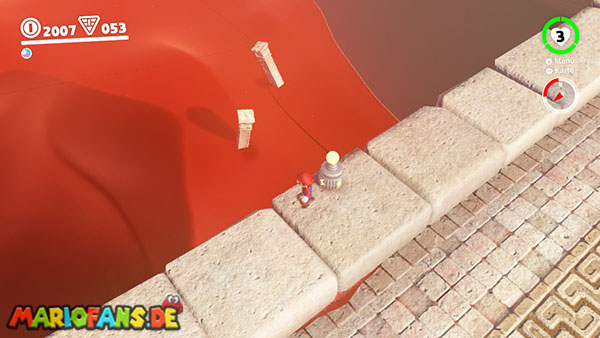 Reise zum Schnellreise-Punkt „Brutzelebene – Siedlung“. Im Süden der Fahne ist ein Schornstein. Schnapp dir einen Röntgolith. Unmittelbar zu Beginn des Abschnitts, wenn du gerade auf die ersten unsichtbaren Plattformen gestiegen bist, kannst du rechts unten eine versteckte Plattform erkennen. Lasst dich auf sie fallen und fahr darauf erst durch den Schlüssel unterhalb des Startgebiets und anschließend wieder hinauf, wo du den nun erschienenen Mond einsammeln kannst.