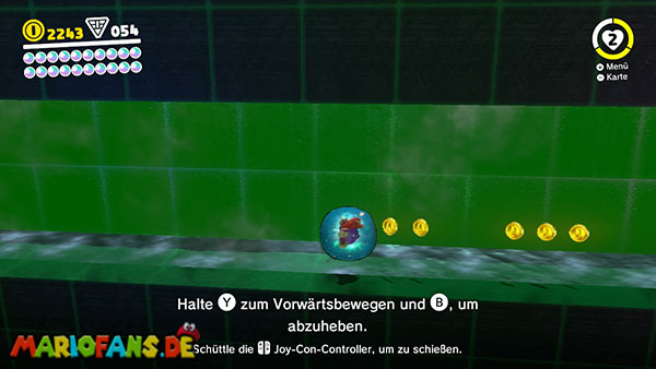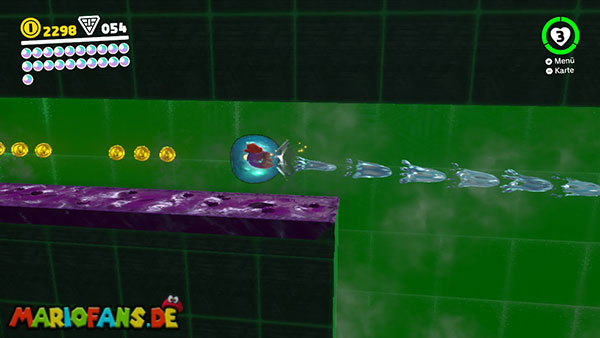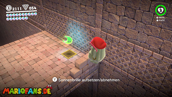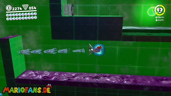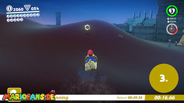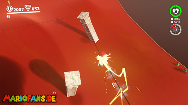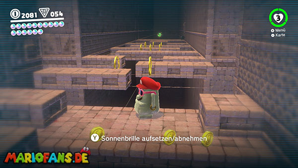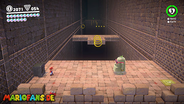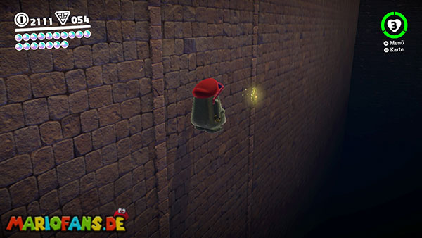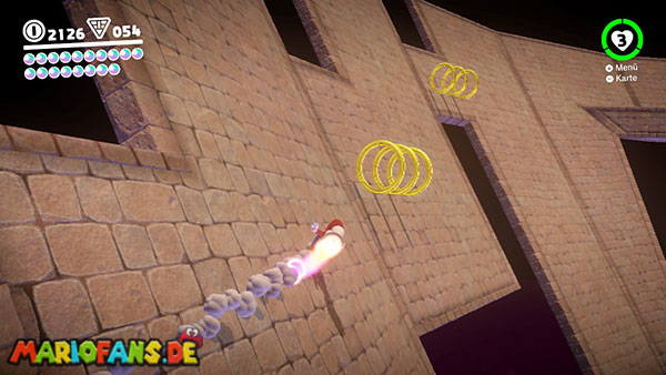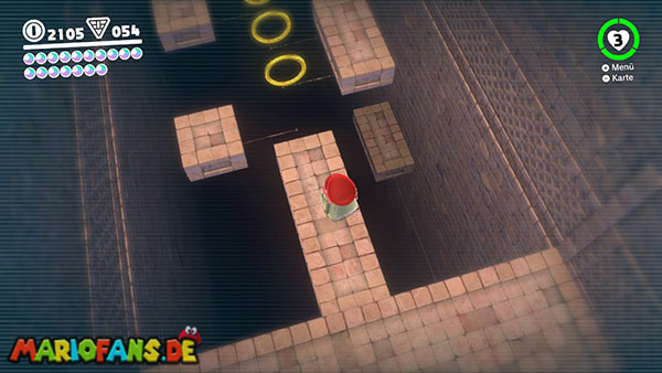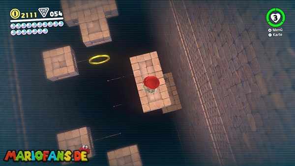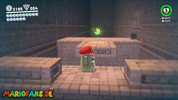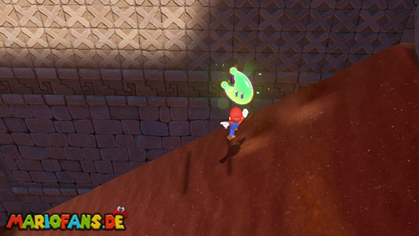 Reise zum Schnellreise-Punkt „Brutzelebene: Ruinen – Eingang„. Dort ist ebenfalls ein Schornstein. Sobald du die Rennstrecke über die Stromleitung erreichst, beginnt sie zusammenzusinken. Hast du den unterirdischen Kurs betreten, kannst du von deinem Startpunkt aus noch gerade so erkennen, dass an der unteren rechten Seite der Bahn ein goldener Schlüssel darauf wartet, von dir eingesammelt zu werden. Natürlich ist das leichter gesagt als getan, da du dort nur wenig Platz zum Manövrieren hast und direkt nach dem Einsammeln steil nach oben flitzen musst, um den Kurs dort abzuschließen. Aber: Schaffst du es, den Schlüssel zu ergattern und den Kurs zu beenden, kanst du dir einen zweiten Mond sichern.