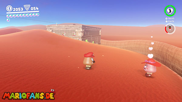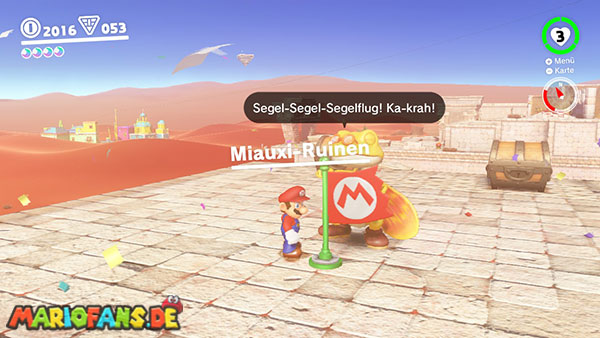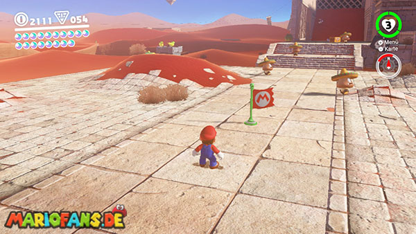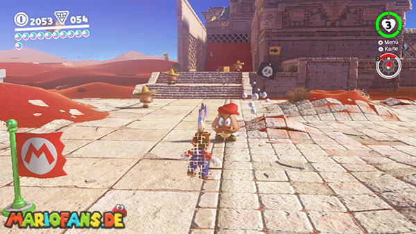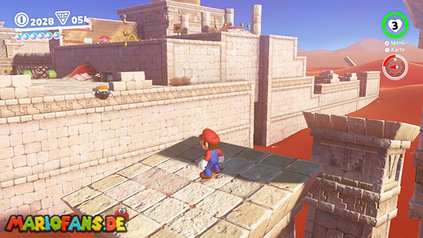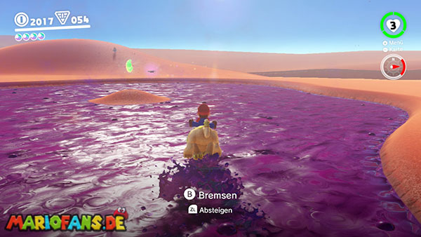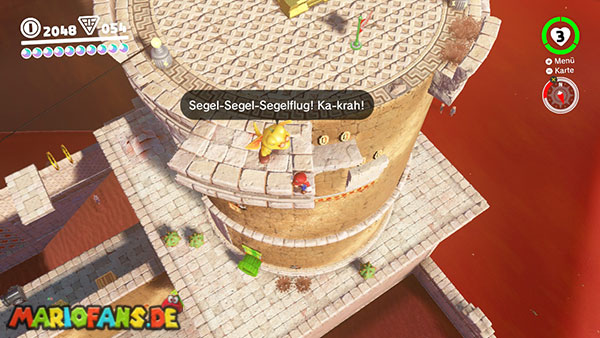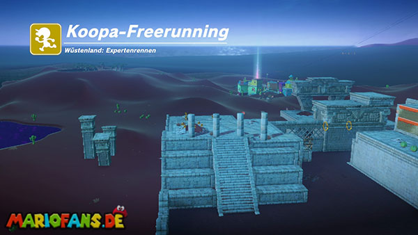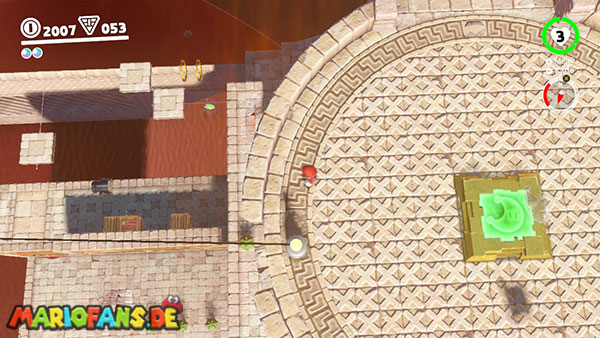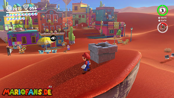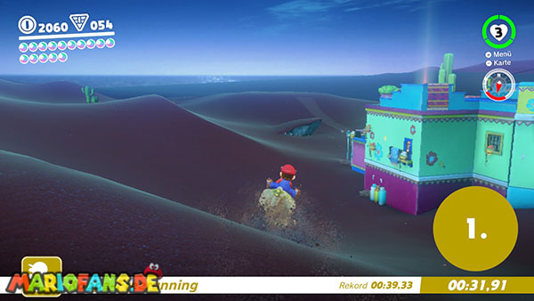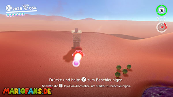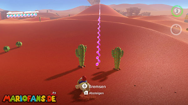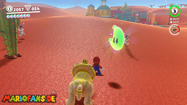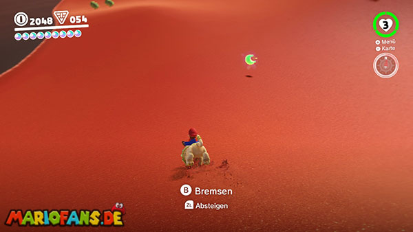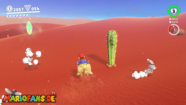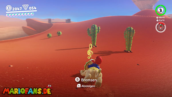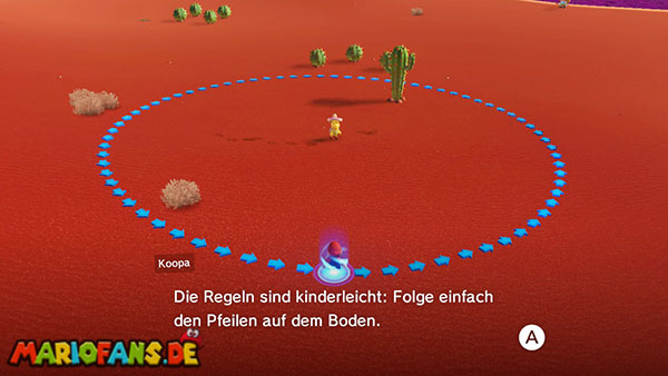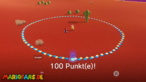 Reise zum Schnellreise-Punkt „Brutzelebene – Siedlung“. Hol dir ein Miauxi und lauf nordöstlich zu einem Koopa. Fordere ihn heraus und versuch den Kreis perfekt nach zu laufen. Nach einigen Versuchen solltest du es mit mehr als 90 Punkten geschafft haben. Nutzt den Kaktus sowie die Büsche als Orientierungspunkte und steuert Mario am besten nur über die Ausrichtung der Kamera, also mit dem rechten Stick.