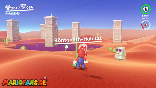 Reise zum Schnellreise-Punkt „Röntgolith-Habitat„. Lauf nach hinten rechts, wo dich eine Plattform nach oben auf die Säule bringt. Lauf über die unsichtbare Brücke zur zweiten Säule und mach in der Mitte eine Stampfattacke. Dann erschein der Power-Mond.