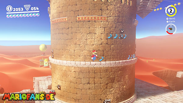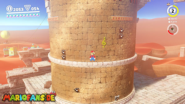 Reise zum Schnellreise-Punkt „Brutzelebene: Ruinen – Runder Turm„. Spring vom runden Turm und geh über die Röhre in das Wandgemälde vom runden Turm. Du findest einen Notenschlüssel und musst alle bunten Noten für den Power-Mond einsammeln.