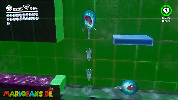 Reise zum Schnellreise-Punkt „Miauxi-Ruinen„. Dort ist in der Umgebung ein Schornstein. Schau am besten auf die Karte, wo das X ist. Flieg im Geheimabschnitt als Düsenkrake bis zu dem hohen „Raum“, in der du die erste blaue fahrende Plattform findest. Diese kannst du nutzen um in den Gang oben links zu gelangen. Fliegt wassersparend, damit du es bis zum Mond ganz links schaffst.