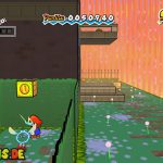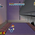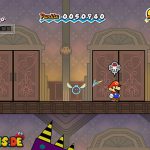 Die Knappis in der Eingangshalle sind nicht gefährlich, aber sie transportieren euch wieder nach draußen, wenn sie euch schnappen. Springt vorsichtig über sie, wobei ein kleiner Hopser auf den Schädel sie für einen kurzen Moment ausknockt. Am Ende des Ganges wechselt ihr in die 3D-Ansicht und geht hinten durch die Tür. Speichert und redet mit dem Hausmädchen Mimi. Tretet zunächst oben durch die erste Tür von links. Schnappt euch den Pilz und ihr aktiviert eine Fallgrube. Unten angekommen müsst ihr nur den Gegner besiegen und könnt links über die Röhre zurück in den Raum gelangen. Verlasst diesen gleich wieder.