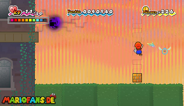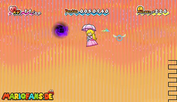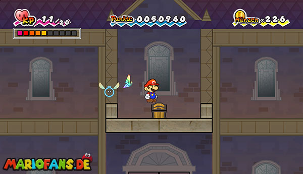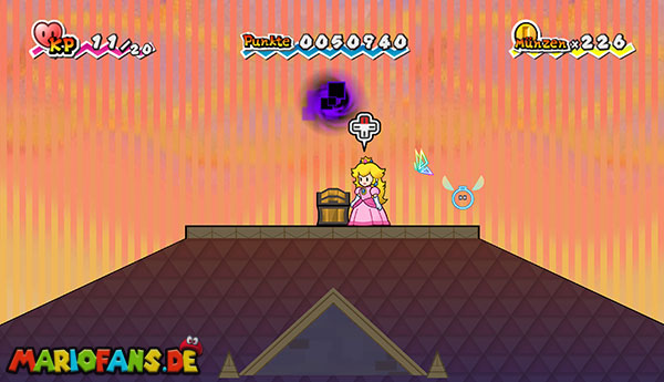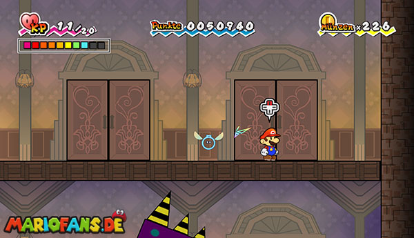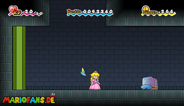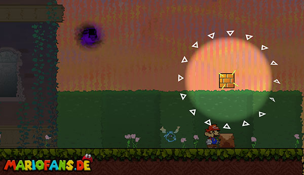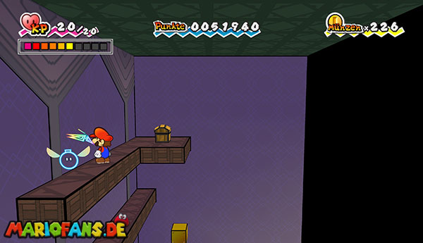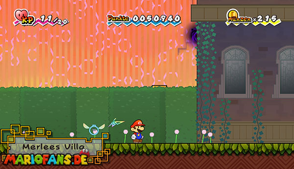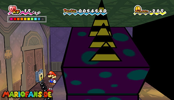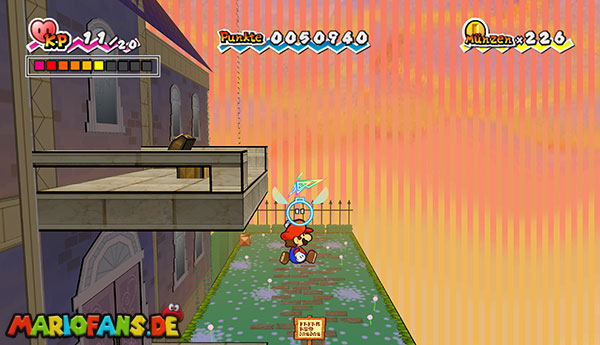 Plündert in 3D den Münzblock links hinter der Hecke. In 2D marschiert ihr rechts bis zum Ende des Abschnittes, steigt auf den Block (vorher mit Tippi sichtbar machen) und hopst hoch, woraufhin eine Kletterpflanze erscheint. Steigt diese nach oben und springt mit Peachs Schirm links runter auf das Hausdach. Öffnet die Kiste, wechselt mit Mario in die 3D-Ansicht und springt schnell (!) nach links auf den Balkon. In 2D öffnet ihr eine weitere Kiste und erhaltet eine Miseria-Karte (078). Springt runter zur Eingangstür und durchschreitet sie.