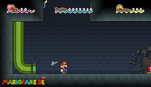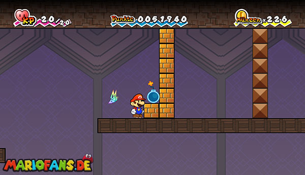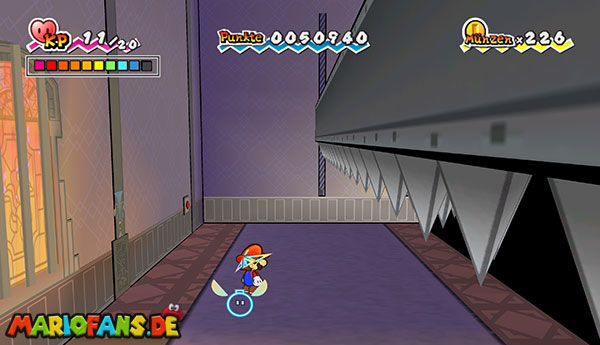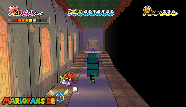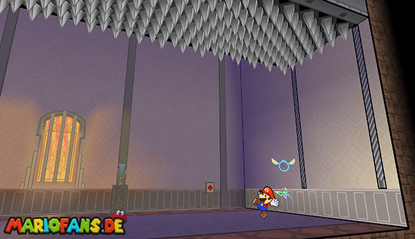 Geht wieder zurück in die große Halle und verlasst das Stockwerk. Die erste Tür unten könnt ihr ignorieren, marschiert deshalb gleich zur zweiten. Den großen Knappi trickst ihr ganz einfach aus, in dem ihr gleich in 3D schaltet und schnell links am Rand zur Tür mit dem Schloss hechtet. Sobald es möglich ist, hopst ihr den Stern an.