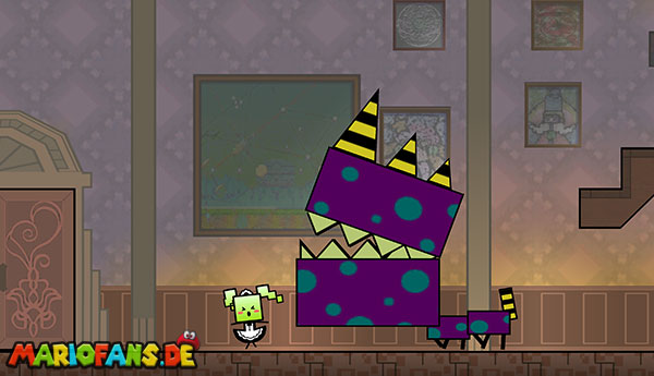 Die Knappis in der Eingangshalle sind nicht gefährlich, aber sie transportieren euch wieder nach draußen, wenn sie euch schnappen. Springt vorsichtig über sie, wobei ein kleiner Hopser auf den Schädel sie für einen kurzen Moment ausknockt. Am Ende des Ganges wechselt ihr in die 3D-Ansicht und geht hinten durch die Tür. Speichert und redet mit dem Hausmädchen Mimi. Tretet zunächst oben durch die erste Tür von links. Schnappt euch den Pilz und ihr aktiviert eine Fallgrube. Unten angekommen müsst ihr nur den Gegner besiegen und könnt links über die Röhre zurück in den Raum gelangen. Verlasst diesen gleich wieder.