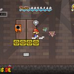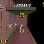 Nehmt die rechte Tür, hopst in 3D ein paar Pfeilblöcke an und geht in 2D wieder durch die rechte Tür. Erneut habt ihr die Wahl zwischen zwei Ausgängen. Weil euch jedoch der linke zurück zum ersten Raum bringt, nehmt ihr den oberen. Im Raum dahinter solltet ihr nicht herunterfallen, außer ihr wollt unbedingt die Münze im Fragezeichenblock plündern. Springt stattdessen gleich bis ganz nach rechts und geht durch die nächste Tür.