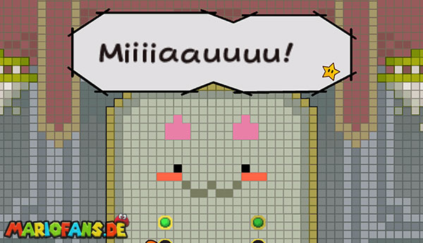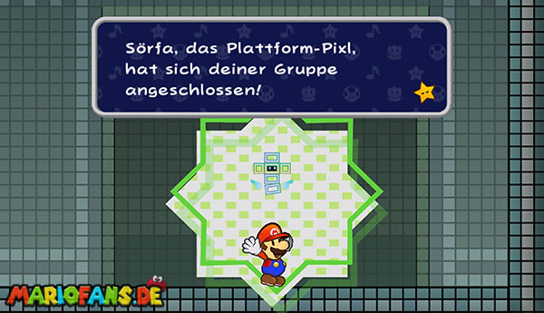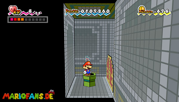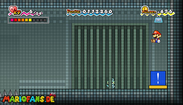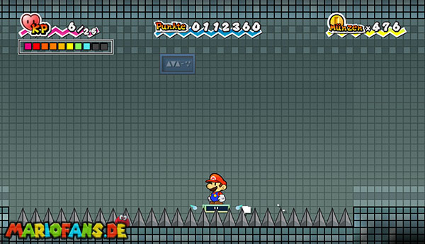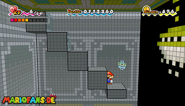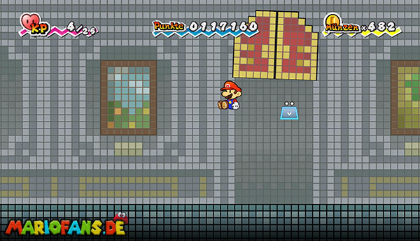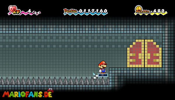 Marschiert bis zum Ende des Abschnitts und drückt den riesigen Schalter mit einer Stampfattacke. Beantwortet die Fragen nach Belieben und flitzt mit Sörfas Fähigkeit links über die Stacheln. Schaltet in 3D, um links durch die Röhre zurück zum Raum von zuvor zu klettern. Speichert noch mal ab und lauft durch die rechte Tür. Schaut durch die beiden Schlüssellöcher und geht rechts gleich zur nächsten Tür. Schaltet um in 3D und springt hinten die Blöcke hoch ins obere Stockwerk. Bleibt gleich in 3D, um dem großen Monster auszuweichen, und geht vorne links durch die Tür. Ihr gelangt in eine Halle mit zwei weiteren Türen, welche, leicht wackelnd, in der Luft schweben. Stampft einmal kräftig mit Stampfo auf, sodass sie herunterfallen. Betretet den rechten der beiden und nutzt Sörfas Fähigkeit, um über die Stacheln zu schweben.