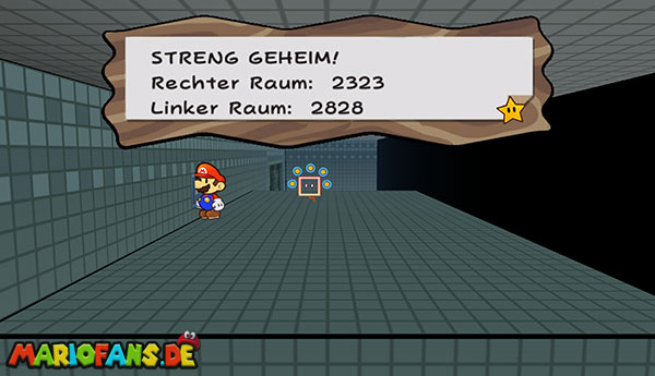 Lauft ganz nach rechts und steigt in 3D in die Röhre. Nehmt mittels Wurfowitz den Stein und werft ihn gegen den blauen Schalter. Schnappt euch den Schlüssel in der Kiste, geht zurück und öffnet die Eingangstür zum Schloss. Speichert ab und schaltet erneut in die 3D-Ansicht. Ganz hinten liegt, gut versteckt, links neben der flachen Tür eine geheime Röhre, durch welche ihr steigt. Lauft nach rechts bis zum Pfeilblock, den ihr anspringt, sodass er von der 2D-Ebene zur 3D-Ebene wechselt. In Letzterer hüpft ihr auf besagten Block und nach hinten über die längliche Plattform. Auf dieser seht ihr in der Mitte ein Schild, welches ihr anklickt und Folgendes erfahrt: linker Raum 2828, rechter Raum 2323.