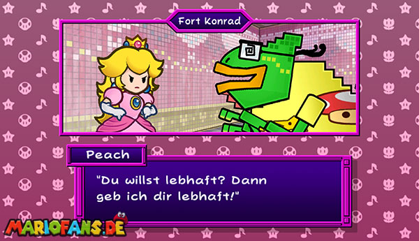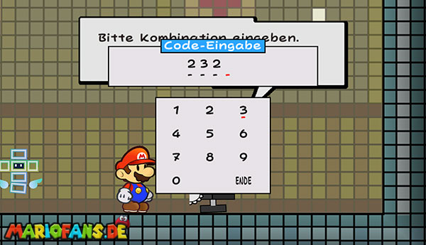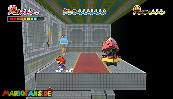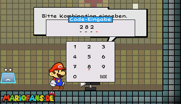 Geht ein paar Schritte nach rechts, bereitet Wurfowitz vor und wartet, bis ein Gegner herangeflogen kommt. Schnappt ihn und werft ihn gegen den blauen Schalter über euch. Marschiert über die Brücke und zur Tür hinein. Redet wieder mit dem Wachroboter, beantwortet wieder alles mit “Wahr“ und gebt nun den anderen Code an: 2828. Benutzt die Tür und macht das Gleiche wie schon einmal: Mithilfe des Haushaltsroboters auf die Plattform mit der Kiste springen und diese öffnen. Erneut versteckt sich ein Pilz in dem Fragezeichenblock.