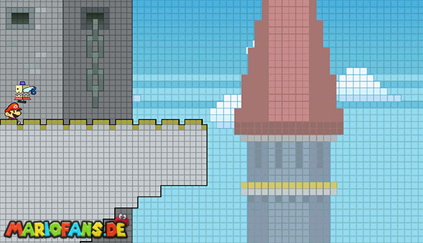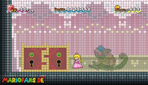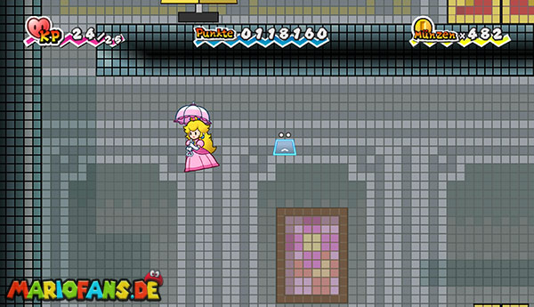 Geht ganz nach links und holt auch hier die Tür per Stampfattacke zu Boden, falls noch nicht geschehen. Tretet ein und schaut über euch: Dort ist ganz schwach eine längliche, dunkelgraue Plattform zu sehen, auf welche ihr mit Anlauf draufspringt. Schaltet um zu Peach und schwebt mit ihrem Schirm nach links zur anderen dunkelgrauen Plattform. Als Mario schaltet ihr in die 3D-Ansicht, springt eventuell nach rechts auf die Plattform, bevor ihr runterfallt, und klettert links die Stufen nach oben. Bleibt erneut in 3D, um dem großen Roboter auszuweichen, und flüchtet zur Tür ganz hinten.