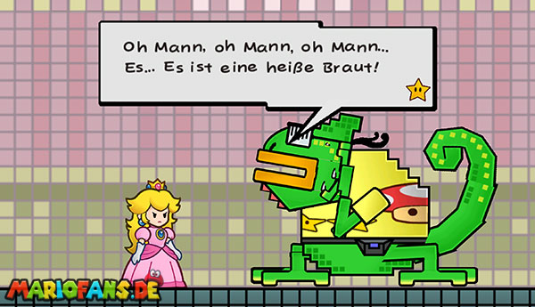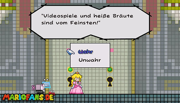 Lauft den Weg zurück bis zur Tür mit den zwei Schlössern. Bevor ihr eintretet, solltet ihr links noch einen Raum zurückgehen und kurz speichern. Benutzt nun die beiden Schlüssel bei besagter Tür. Doch trotzdem bleibt euch der Zutritt verwehrt, denn nur “total heiße Bräute“ dürfen eintreten. Weicht den Laserstrahlen aus, indem ihr bis ganz nach rechts in die Ecke flüchtet. Schaltet um zu Peach und versucht es erneut. Beantwortet wie gewohnt alles mit “Wahr“ und tretet endlich ein. Antwortet beim folgenden Minispiel nach Belieben, wobei wir euch des Spielspaßes wegen zur Unfreundlichkeit raten.