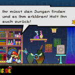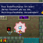 Einen kurzen Besuch später erfolgt die Erkenntnis: Ohne Hilfsmittel kommt ihr nicht weit. Wieder in Flipstadt besucht ihr zunächst Merlon. Verlasst seine Hütte und benutzt rechts den Fahrstuhl zur Ebene 3. Gleich links steht ein kleiner Junge mit einem Goldfischglas. Sprecht ihn an und ihr erhaltet es. Geht zurück zur Ebene 2 und benutzt gleich den Fahrstuhl weiter links zur Ebene 1. Ein Stückchen rechts gelangt ihr zu noch einem Fahrstuhl, der euch runter ins erste Untergeschoss bringt. Stellt euch vor das Wasser und lasst den Goldfisch frei. Geht wieder zurück zur grünen Tür, welche euch jetzt gefahrlos ins Weltall bringt.