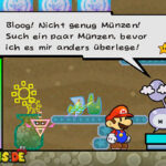 Wieder draußen scheint es rechts von der Tür einzig nach unten zu gehen, doch sobald ihr zur 3D-Sicht wechselt, seht ihr einen schmalen Steg, der euch weiter nach hinten führt. Nutzt diesen, durchlauft den “Berg“ und schaltet dahinter zurück in die 2D-Ansicht. Klettert denselben “Berg“ links hoch, springt auf die Plattform und hoch in die Röhre hinein: Es winken ein paar Extramünzen. Kehrt zurück und fallt am “Berg“ direkt rechts runter. Geht, wenn ihr wollt, durch die Tür, plättet die Gegner und plündert ein paar Fragezeichenblöcke. Hinter der Tür ganz rechts betretet ihr wieder das Haus eines Außerirdischen, der euch bezüglich der Story ebenso wenig weiterbringen wird wie der andere zuvor.