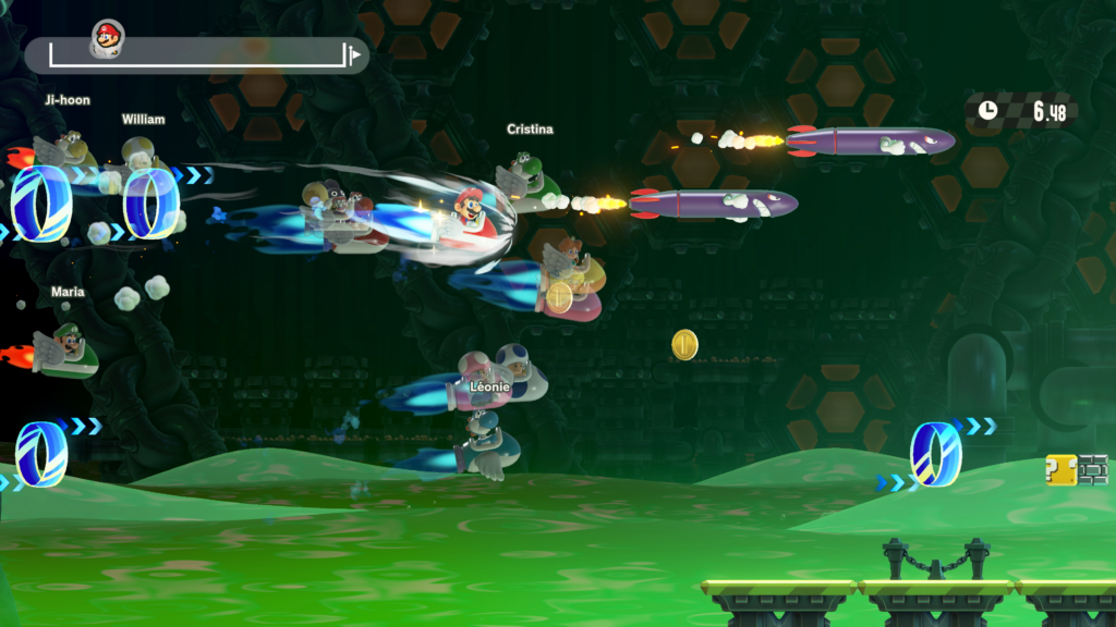 - Hilfe-Modus: Ist dies der erste Ausflug der Spieler:innen ins Blumenkönigreich, finden sie im Hilfe-Modus bei Bedarf verschiedene nützliche Hilfestellungen. Aktivieren sie diese, können sie sich etwa nach einem unerwarteten Sturz in die Tiefe ohne den Verlust eines Lebens wieder zurücksetzen oder durch Gegner verursachte Schäden deaktivieren.